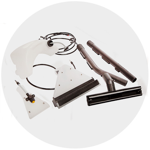Влажную чистку агрегат производит при помощи комплекта для такой уборки, который поставляется вместе с ним. Он глубоко проникает в волокна, способен разбрызгивать моющее средство и тут же убирать остатки загрязнений с очищаемой поверхности.