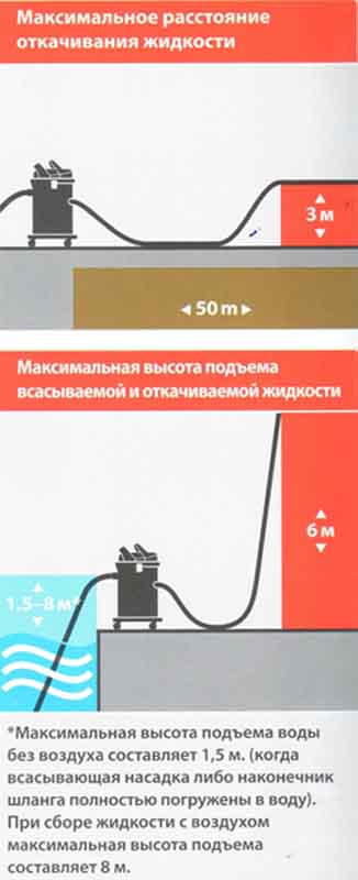 Поднимать жидкость в бак для последующего откачивания пылесос может с глубины до 2,5 метров, если конец шланга или насадка полностью погружены в жидкость, и с глубины до 5 метров, если собираемая жидкость всасывается с воздухом.