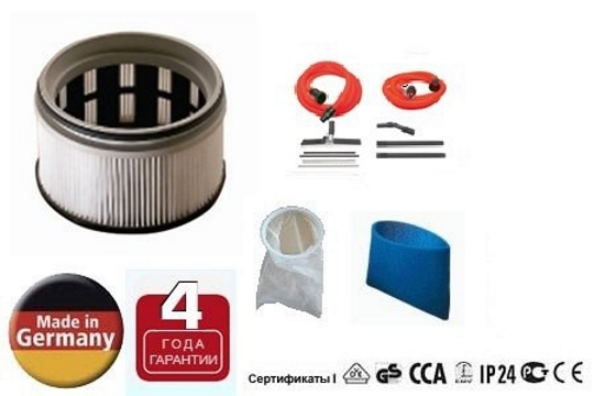 - В комплект поставки входит мешок-фильтр, полиэфирный фильтр (площадь фильтрующей поверхности 3600 см2), а также губчатый фильтр (для жидкости);