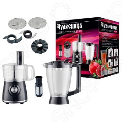 Кухонный процессор «Чудесница 5 в 1» — многофункциональный прибор для нарезки, измельчения, смешивания и взбивания продуктов. Это целый кухонный комбайн, в который входят измельчитель 1,2 л., блендер 1,5 л., овощерезка, соковыжималка для твердых овощей и фруктов и кофемолка. С помощью комбайна вы за считанные секунды справитесь с измельчением любых продуктов для крем-супа, воздушного омлета, коктейля, смузи, мусса, детского питания и многого другого. С ним процесс приготовления любимых блюд станет еще быстрее и проще.