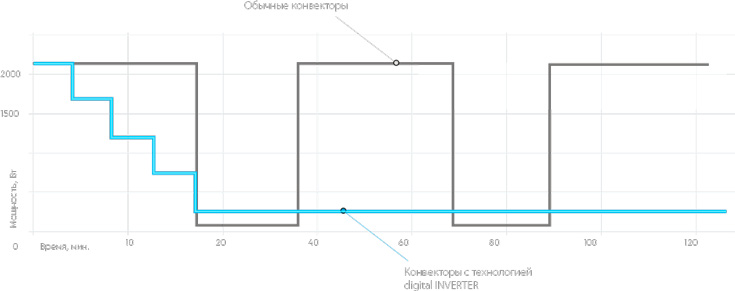 Конвектор с инверторным блоком управления начинает работу на максимальной мощности и снижает её по мере достижения установленной температуры.