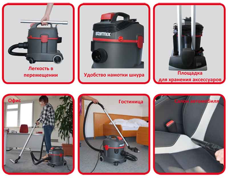 Практичные аксессуары и возможность их крепления на корпусе, небольшой вес позволяют при необходимости легко переносить пылесос Starmix TS 714 RTS HEPA со всеми аксессуарами одной рукой. Большая кнопка (можно включать ногой). Повышенная шумоизоляция, высокая устойчивость, в т. ч. при перемещении через пороги и другие препятствия. 3-слойный флисовый фильтр-корзина.