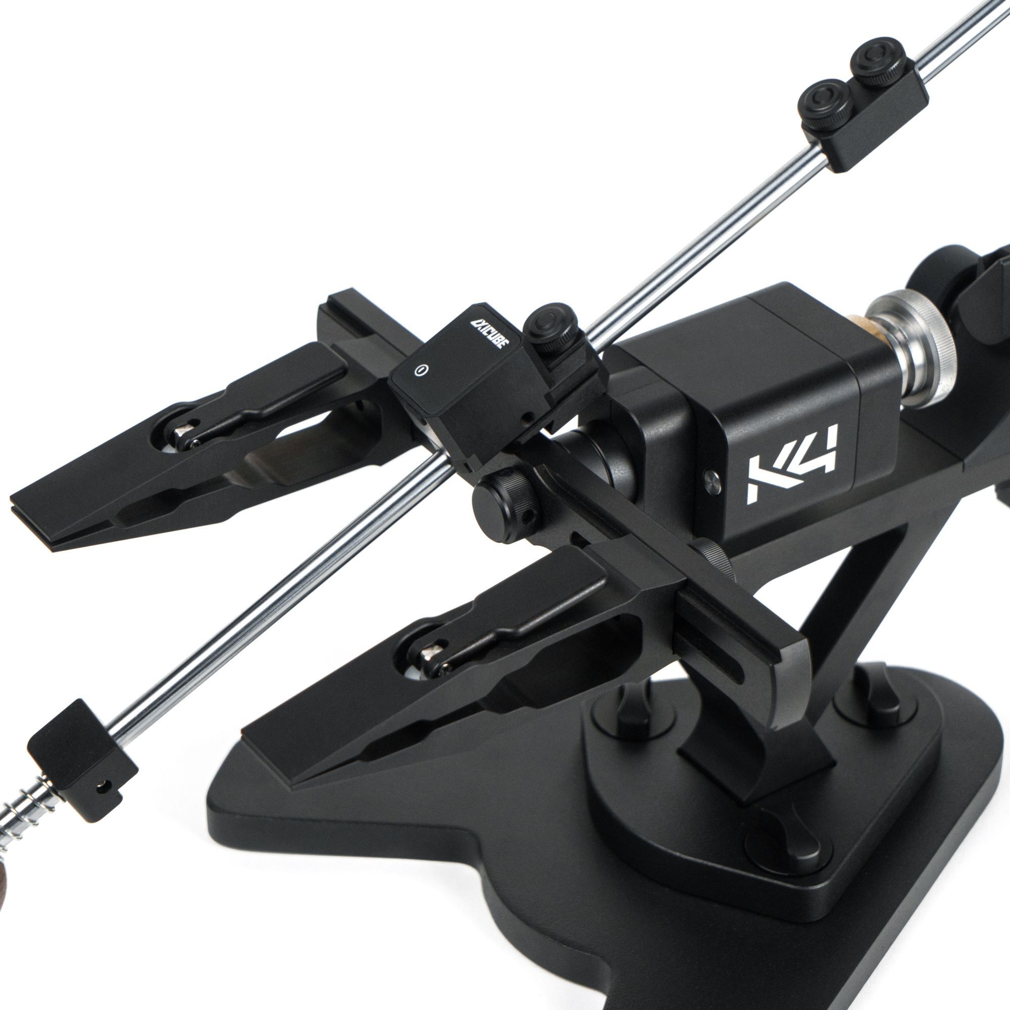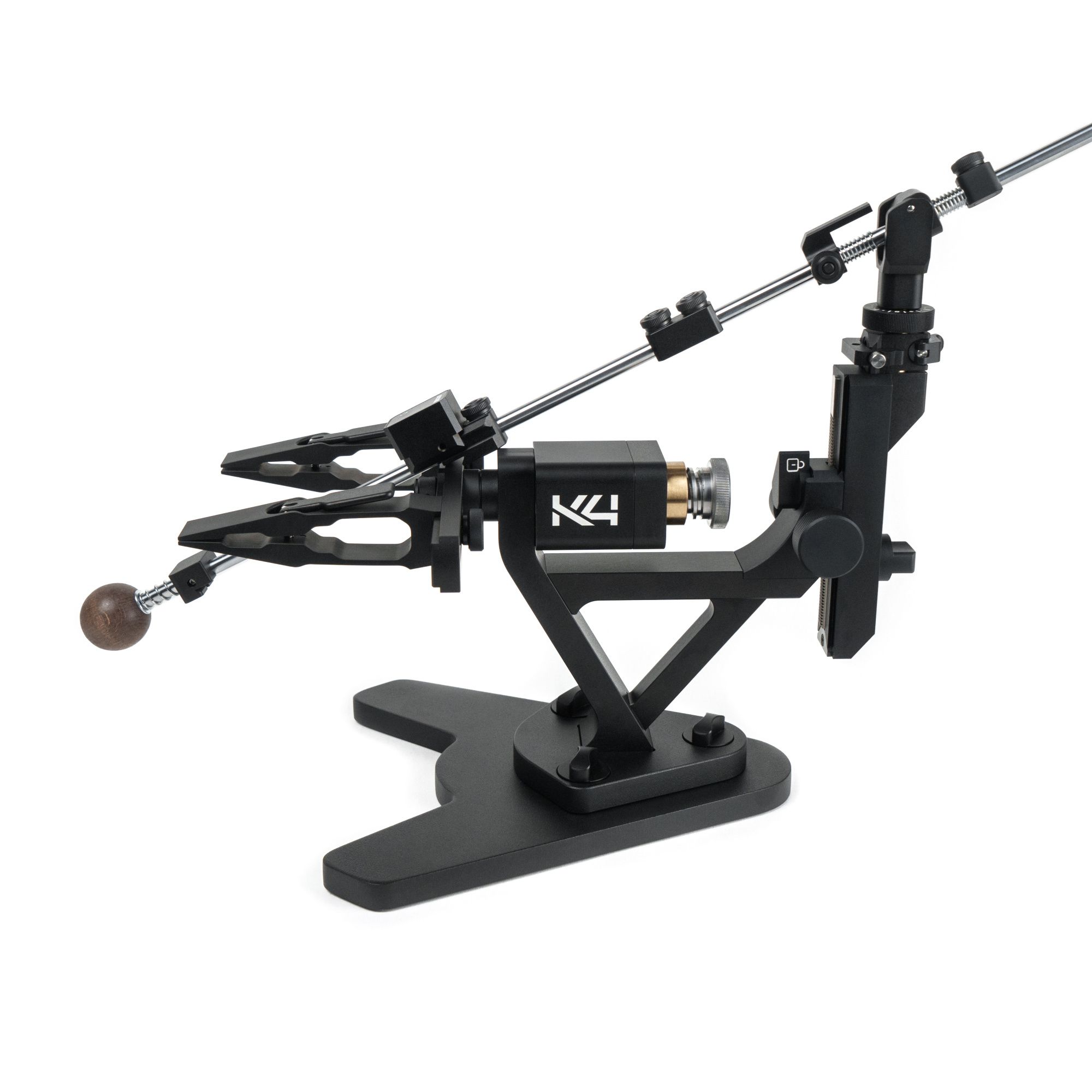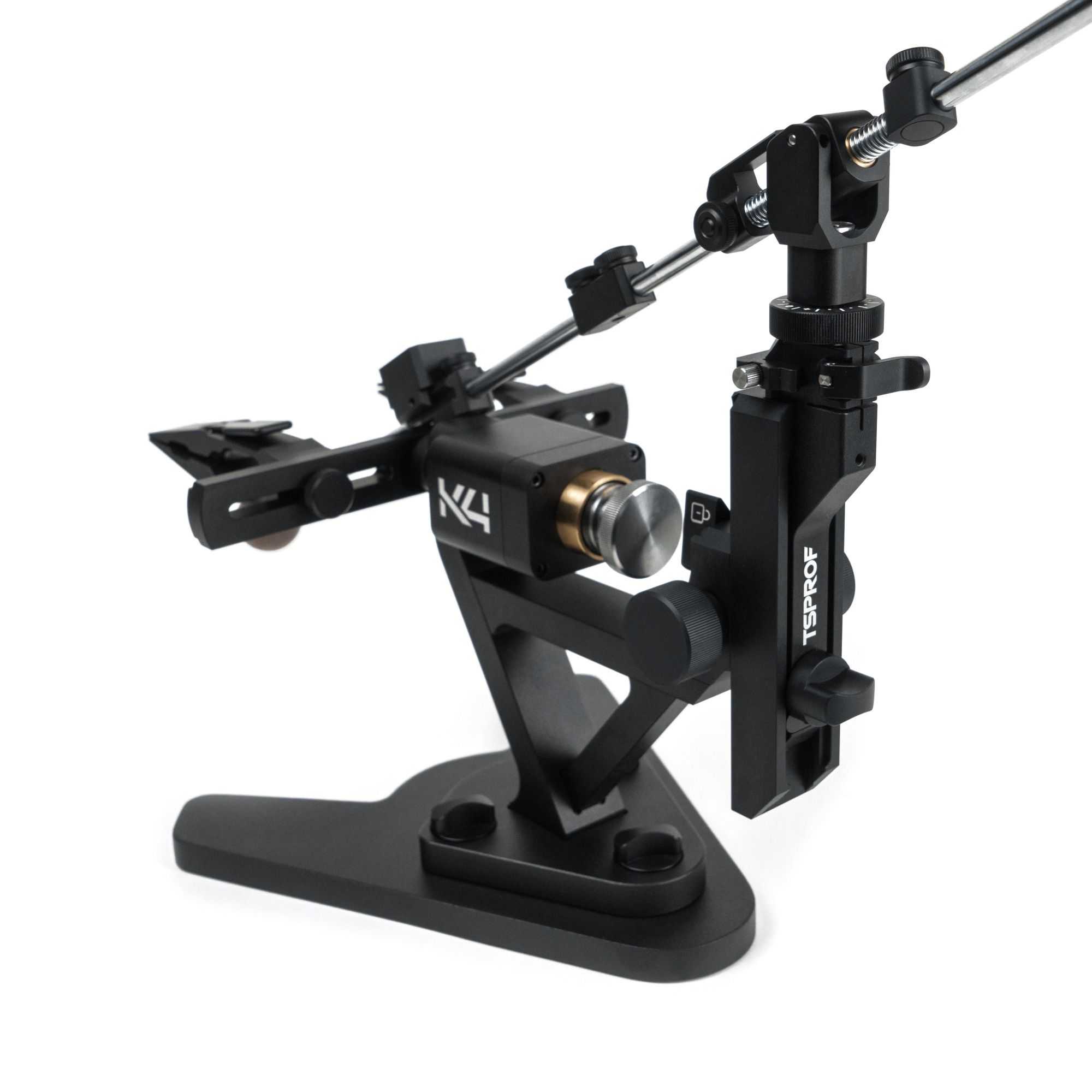 Основой данного набора является система заточки TSPROF К4 в матовом чёрном анодировании. Система оснащена поворотным механизмом с регулируемым усилием переворота рамки, реечным подъёмником, с бесступенчатой регулировкой угла и микроподачей для сверхточной настройки, держателем абразива со съёмным электронным угломером Axicube Shift на планке Пикатинни, который является незаменимым помощником при выставлении угла заточки.
