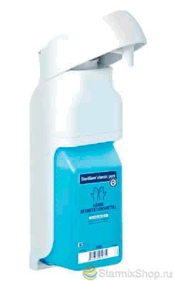 Удобный модульный диспенсер для дозирования кожного антисептика, моющего или ухаживающего средства. Использованный флакон быстро заменяется на новый.