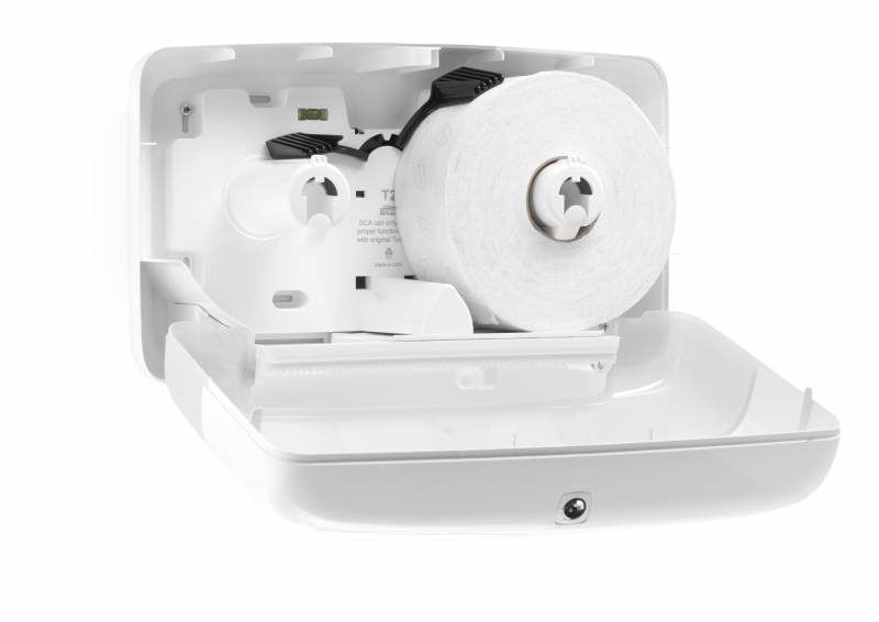 Диспенсеры серии Tork Elevation удачно сочетают стильный дизайн и функциональность, и подходят для любых туалетных комнат. Предназначен для туалетных комнат средней и высокой проходимости. Вмещает 2 мини рулона туалетной бумаги Т2. Очень компактный. Емкость до 340м. Наличие запасного рулона. Доступ к запасному рулону открывается, после окончания основного рулона. 100% использование каждого рулона. Стопор для плавного вращения и преотвращения перерасхода.