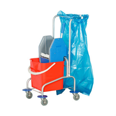 Небольшие габариты тележки легко позволяют ей проехать в самых узких (допустимых нормами пожарной безопасности) проходах, например между витрин, мебели, не мешая потоку посетителей, и подчеркивая внешний вид уборки. Самый идеальный вариант уборки пола небольших помещений (торговые павильоны, коридоры, небольшие фойе Ведро и база тележки допускают применение любых моющих растворов. Расположенный на тележке полиэтиленовый мешок позволяет собрать мусор с пола, из корзин, урн