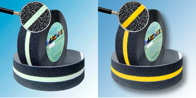 Чередующиеся яркие, контрастные полосы сигнальных противоскользящих лент хорошо просматриваются на расстоянии и способствуют повышению уровня внимания. В случаях, когда необходимо обезопасить неосвещенные участки в темное время суток или в случаях аварийного отключения света, можно применять сигнальные или стандартные антискользящие фотолюминесцентные абразивные ленты. Люминесцентные полосы заряжаются энергией от дневного или искусственного света и впоследствии светятся в темноте до 24 часов.
