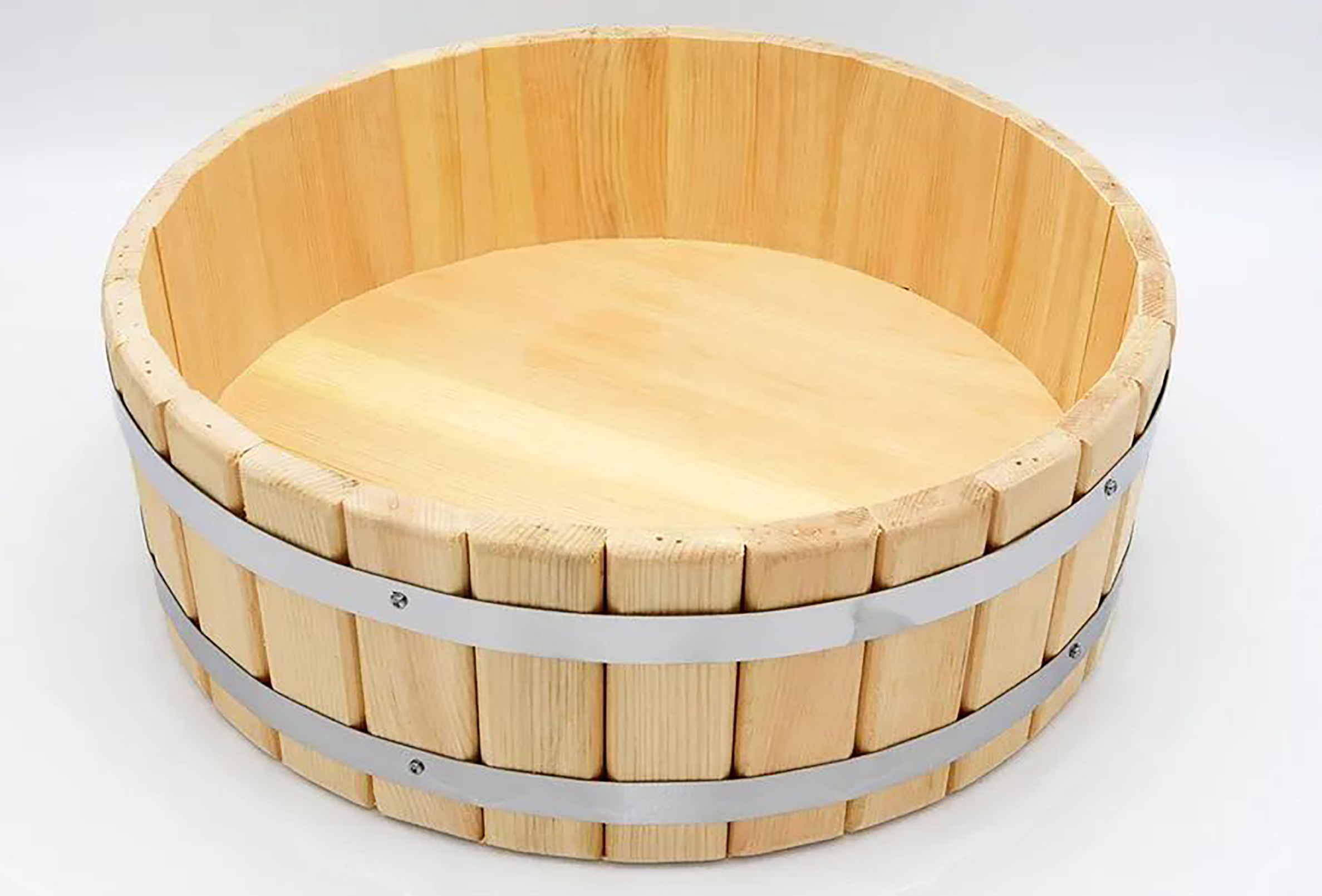 Эта кадка, предназначенная для риса, замешиваемого для суши. Древесина очень пористая, что позволяет впитывать дополнительную влагу.