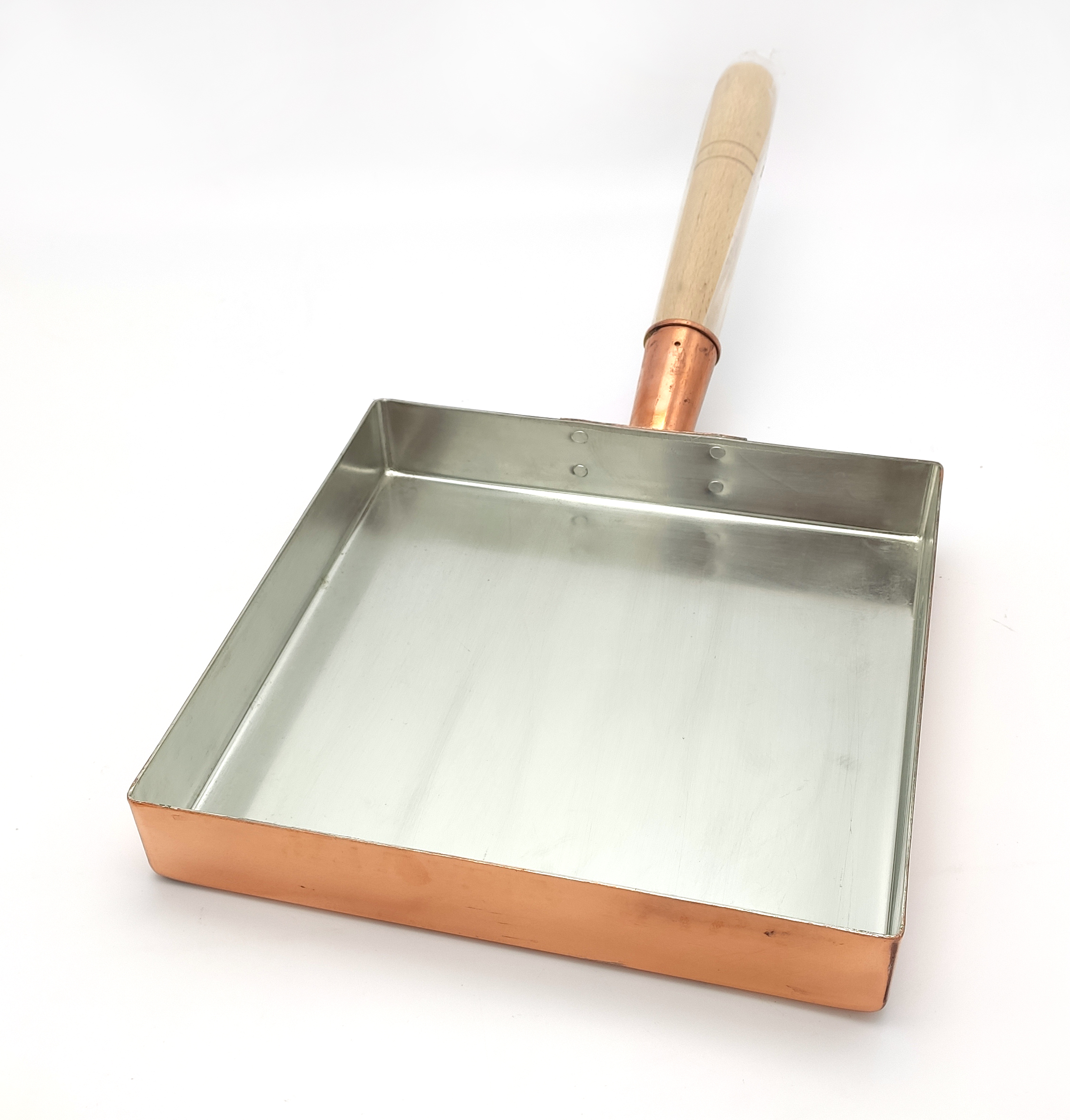 Сковорода Тамаго-яки 1602304 размером 24 на 24 см - специальная квадратная сковорода для того, чтобы приготовить японский закрученный омлет. Аксессуар очень прочный, изготовлен из меди и покрыт изнутри оловом – такой вариант считается лучшим среди макиякинабэ. Вместе со сковородой поставляется деревянная крышка, которая не только способствует приданию нужной плотной консистенции блюда, но и помогает переворачивать омлет в ходе приготовления.