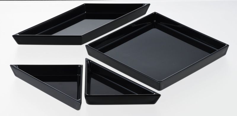 Сервировочный набор состоящий из тарелочек "квадрат", "треугольник" и "ромб", которые могут быть уложены в шестиугольном лотке, как в головоломке.