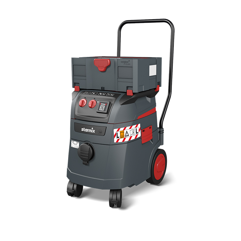 Пылесос Starmix iPulse L 1635 Top для использования на строительных площадках, в ремонтных цехах и мастерских в комплектации «top»: система Smartfix (рейка для крепежа систейнеров), 2 фиксирующие застежки на липучке, профессиональные принадлежности из нержавеющей стали.