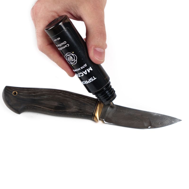 Масло камелии предназначено для смазки клинков ножей из углеродистых сталей. Подходит для защиты кухонных, охотничьих и складных ножей от коррозии при хранении в условиях умеренной влажности воздуха. Может применяться, как для «классических» углеродистых сталей, так и для современных порошковых быстрорезов, с содержанием хрома в составе менее 14%.