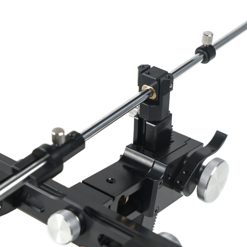 Поворотный механизм точилки TSPROF Kadet Pro GE помогает сохранить одинаковый угол заточки на обеих сторонах ножа. Допустимая погрешность при перевороте рамки составляет 0,4°. После переворота рычаг намертво фиксирует рамку с зажимами. Вращением ручки подъема, поворотный узел плавно движется вокруг виртуального центра, в котором находится режущая кромка ножа. Дуговая стойка изготовлена из единого куска алюминия и интегрирована с реечным подъемником с зубчатым зацеплением. Стопорный рычаг, после настройки необходимого угла, позволяет надежно зафиксировать крепление поворотного узла. В комплекте уже установлен модифицированный шарнирный узел Glide, который обеспечивает более плавный ход штанги без заеданий и трения.