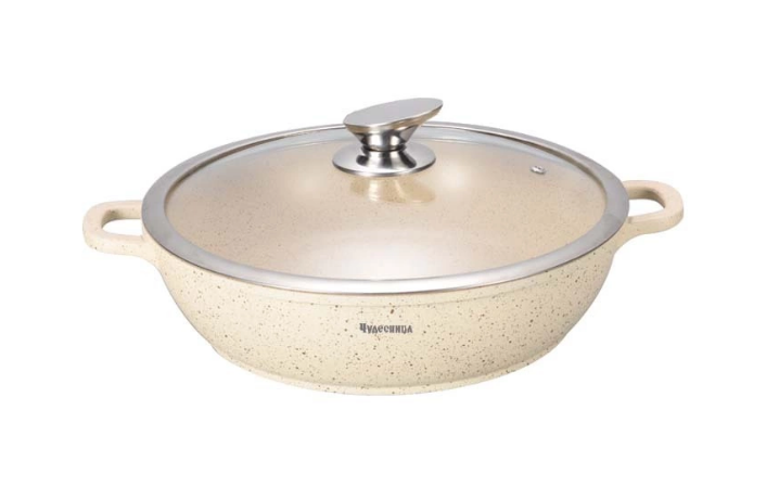 Жаровня с крышкой ЧУДЕСНИЦА - это идеальный помощник на кухне. Литой алюминий, стеклянная крышка с системой Aroma-фильтр, объем 3.5л, толщина 5мм, размер 28х7,5см, 3-х слойное антипригарное мраморное покрытие, 5-ти слойное теплоаккумулирующее дно, подходит для всех видов плит, включая индукционные, можно мыть в посудомоечной машине, литые ручки с силиконовыми накладками.