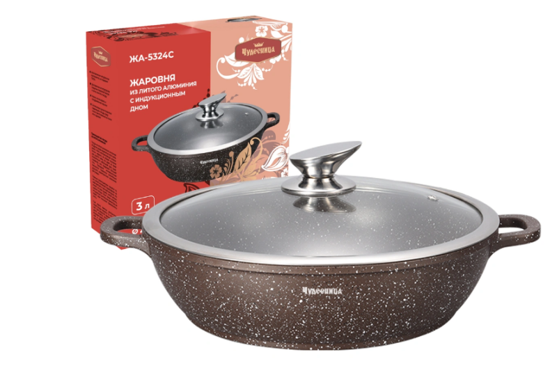 Жаровня с крышкой ЧУДЕСНИЦА - это идеальный помощник на кухне. Литой алюминий, стеклянная крышка с системой Aroma-фильтр, объем 6л, толщина 5мм, размер 36х7,5см, 3-х слойное антипригарное мраморное покрытие, 5-ти слойное теплоаккумулирующее дно, подходит для всех видов плит, включая индукционные, можно мыть в посудомоечной машине, литые ручки с силиконовыми накладками.
