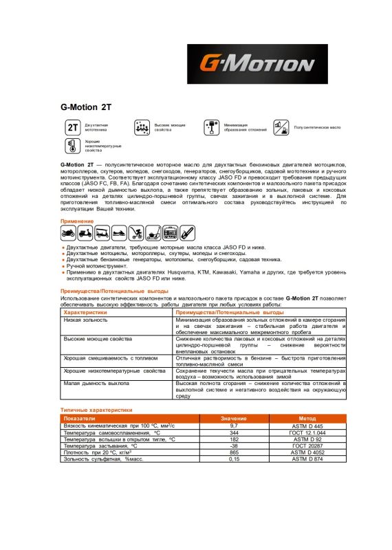 Масло G-Motion 2T G-Energy рекомендуется для использования с двухтактными двигателями мотоциклов, мотороллеров, скутеров, мопедов, снегоходов, к которым требуются масла класса JASO FD и ниже. Допустимо применение в двухтактных двигателях Husqvarna, KTM, Kawasaki, Yamaha, а также в садовой технике.