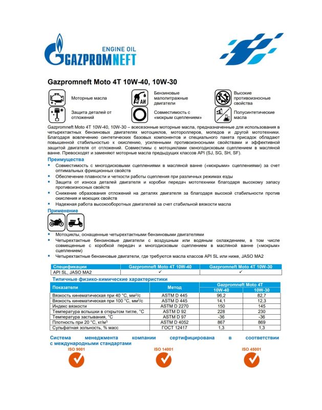 Масло Moto 4T 10W-40 1л Gazpromneft рекомендовано для четырехтактных бензиновых двигателей мотоциклов, мотороллеров, мопедов и другой мототехники. Подходит для двигателей мототехники с многодисковым сцеплением в масляной ванне («мокрым» сцеплением).