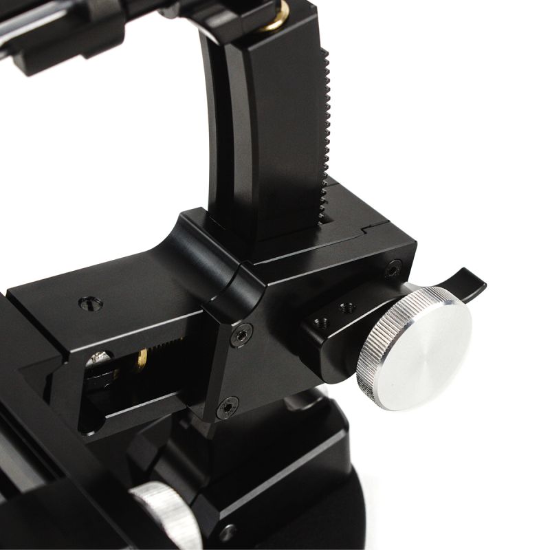 Поворотный механизм точилки TSPROF Kadet Pro помогает сохранить одинаковый угол заточки на обеих сторонах ножа. После переворота рычаг намертво фиксирует рамку с зажимами. Вращением ручки подъема, поворотный узел плавно движется вокруг виртуального центра, в котором находится режущая кромка ножа. Дуговая стойка изготовлена из единого куска алюминия и интегрирована с реечным подъемником с зубчатым зацеплением. Стопорный рычаг, после настройки необходимого угла, позволяет надежно зафиксировать крепление поворотного узла.